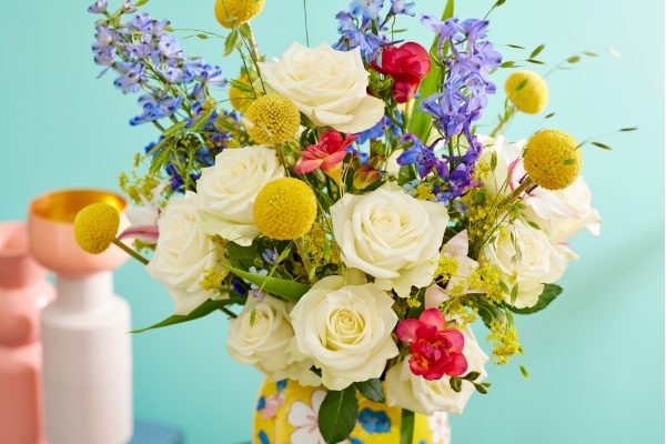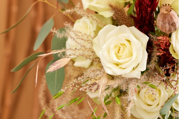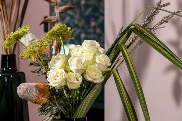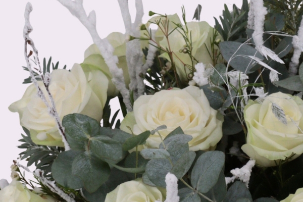 Dans un arrangement avec de feuillages, du waxflower et des branches de bouleau enneigées, la rose est parfaitement mise en valeur. Même dans un bouquet mono-floral, la rose Snowstorm+ rayonne. Facile à utiliser et à transporter, cette rose gagne de plus en plus en popularité..